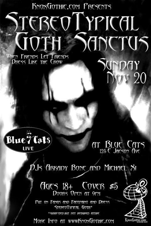 A night to break out the fangs, face paint, cloves, and heavy eyeliner, and black clothes, and put your hand to your forehead. Whatever will make you into the "Stereotypical Goth" is the fashion of the night. In otherwords, a night to have fun parodying ourselves, and dancing to all those sterotypical Goth hits!*